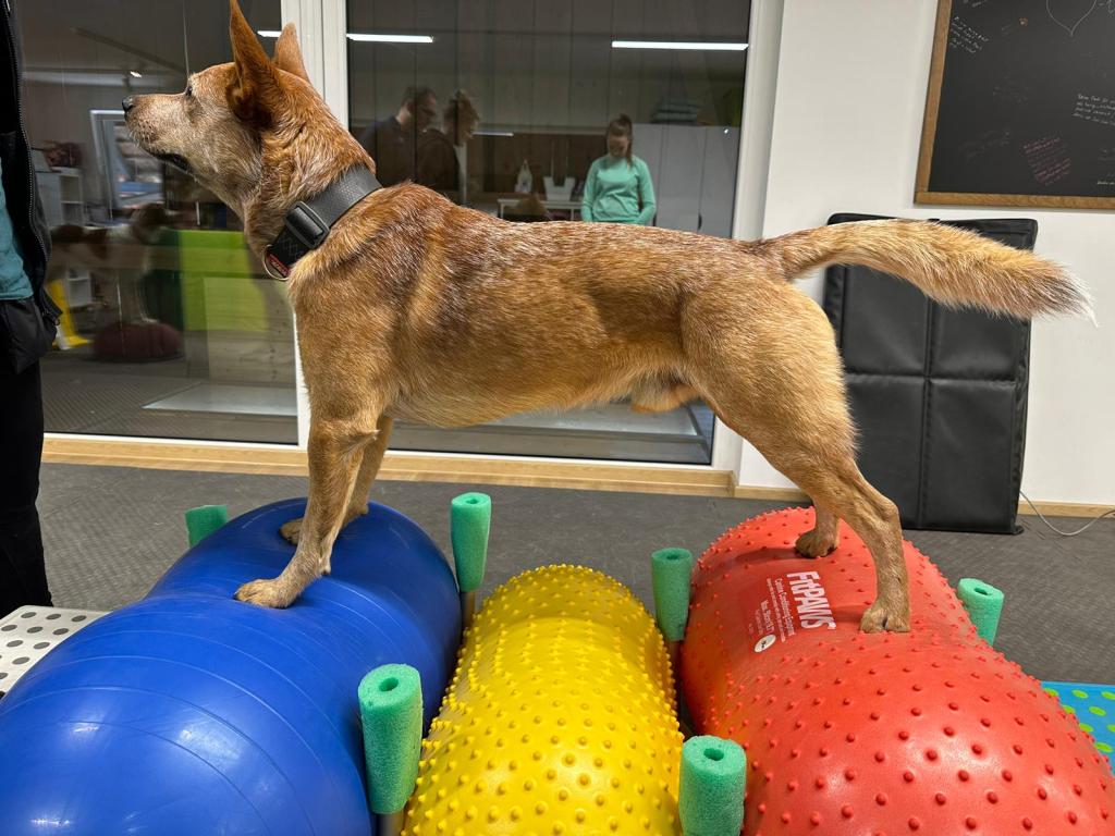In aktiver Mitarbeit lernt der Hund verschiedene Arten von Hindernissen zu überwinden. Dabei können ganz gezielt bestimmte Muskelgruppen sowie das Körpergefühl und die Feinmotorik trainiert werden.
